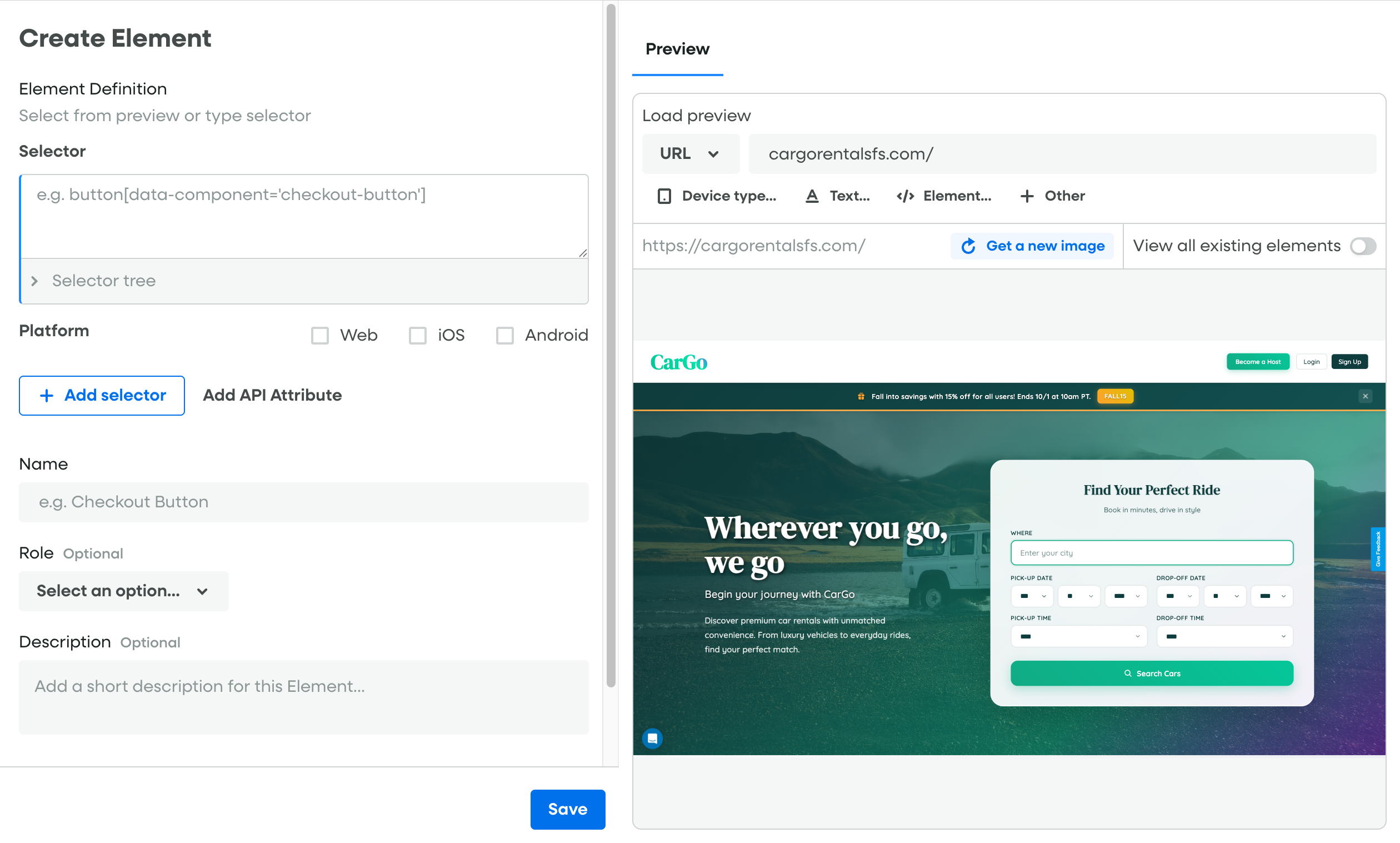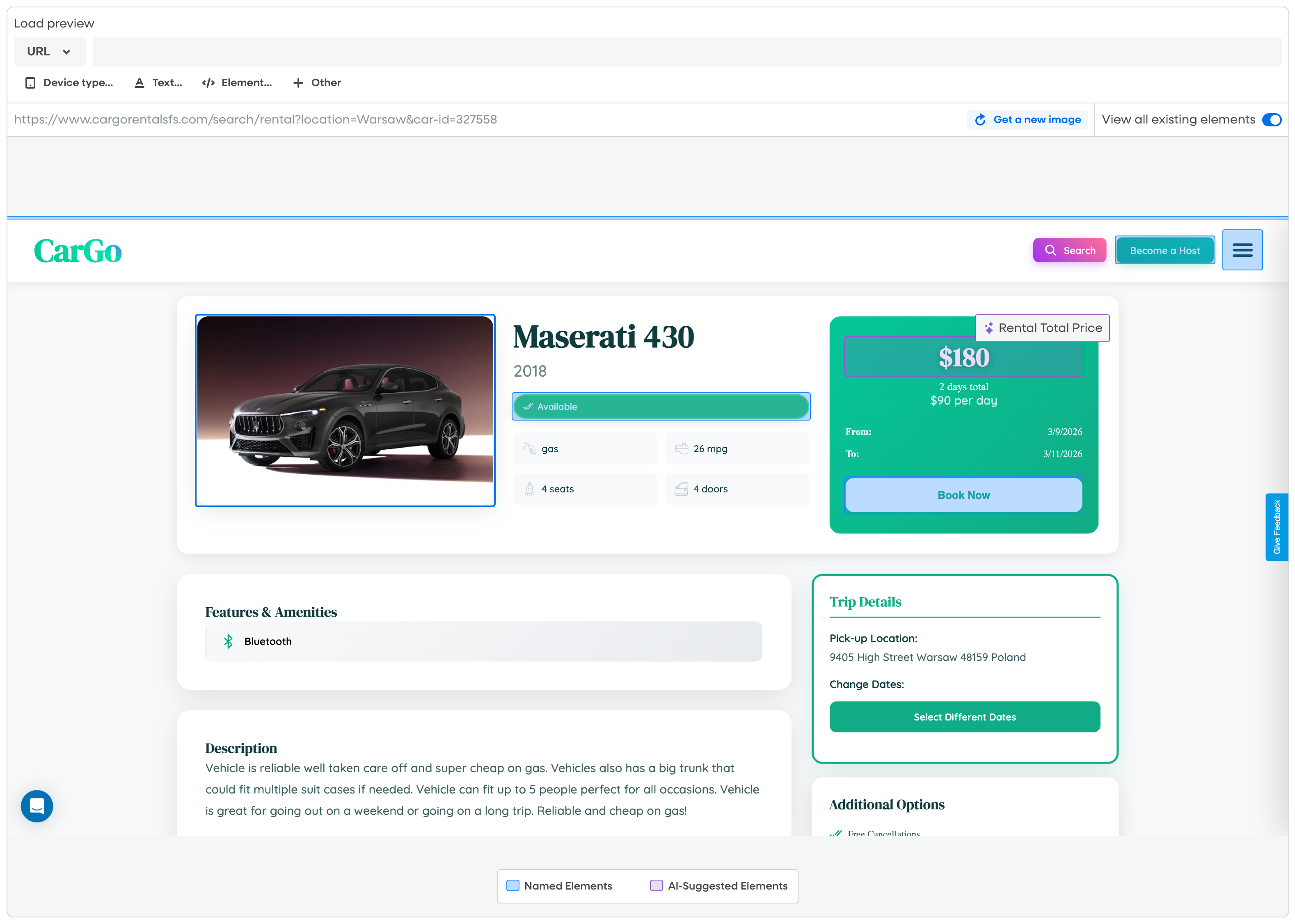 Hover over blue Named Elements and purple AI-Suggested Elements to see their name. Click on any other element that you may wish to add to review its selector.
