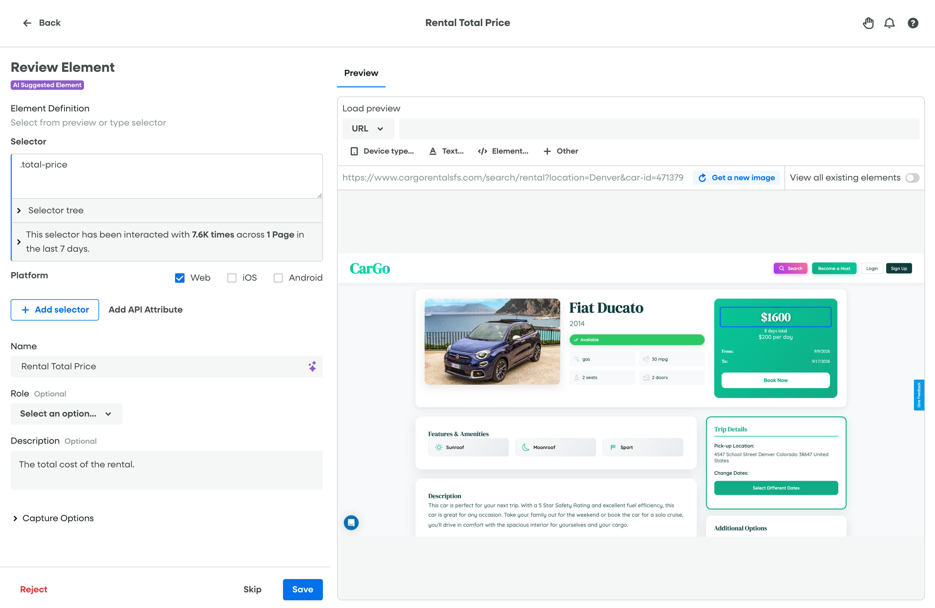 - Click the name of your AI Suggested Element. In the example above, it was "Rental Total Price", but yours will be specific to your account and use case.