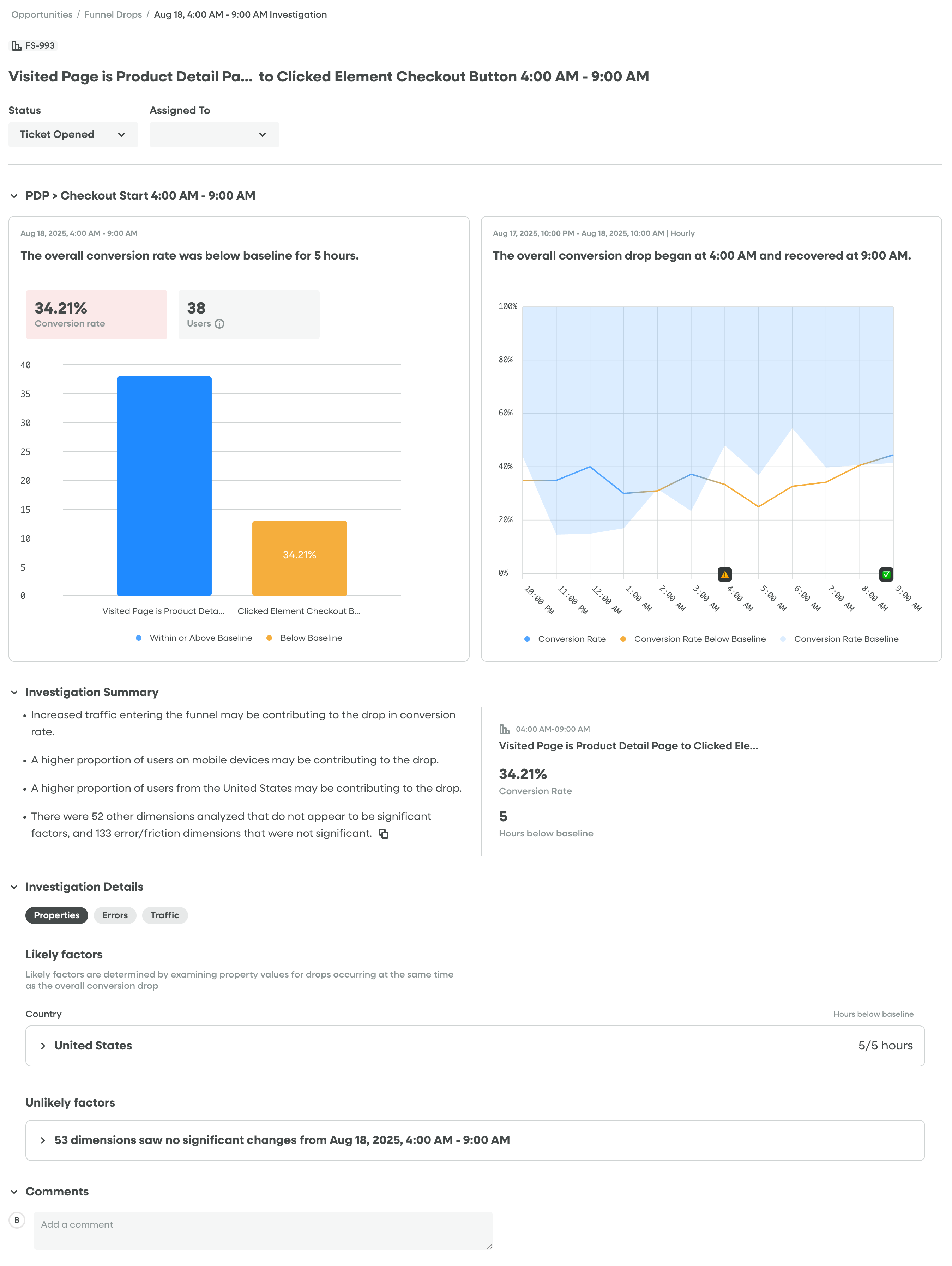 When you click the Investigate button on a funnel drop, it will take you to a detailed page where you can start triaging and dive deeper into likely factors that contributed to the drop.