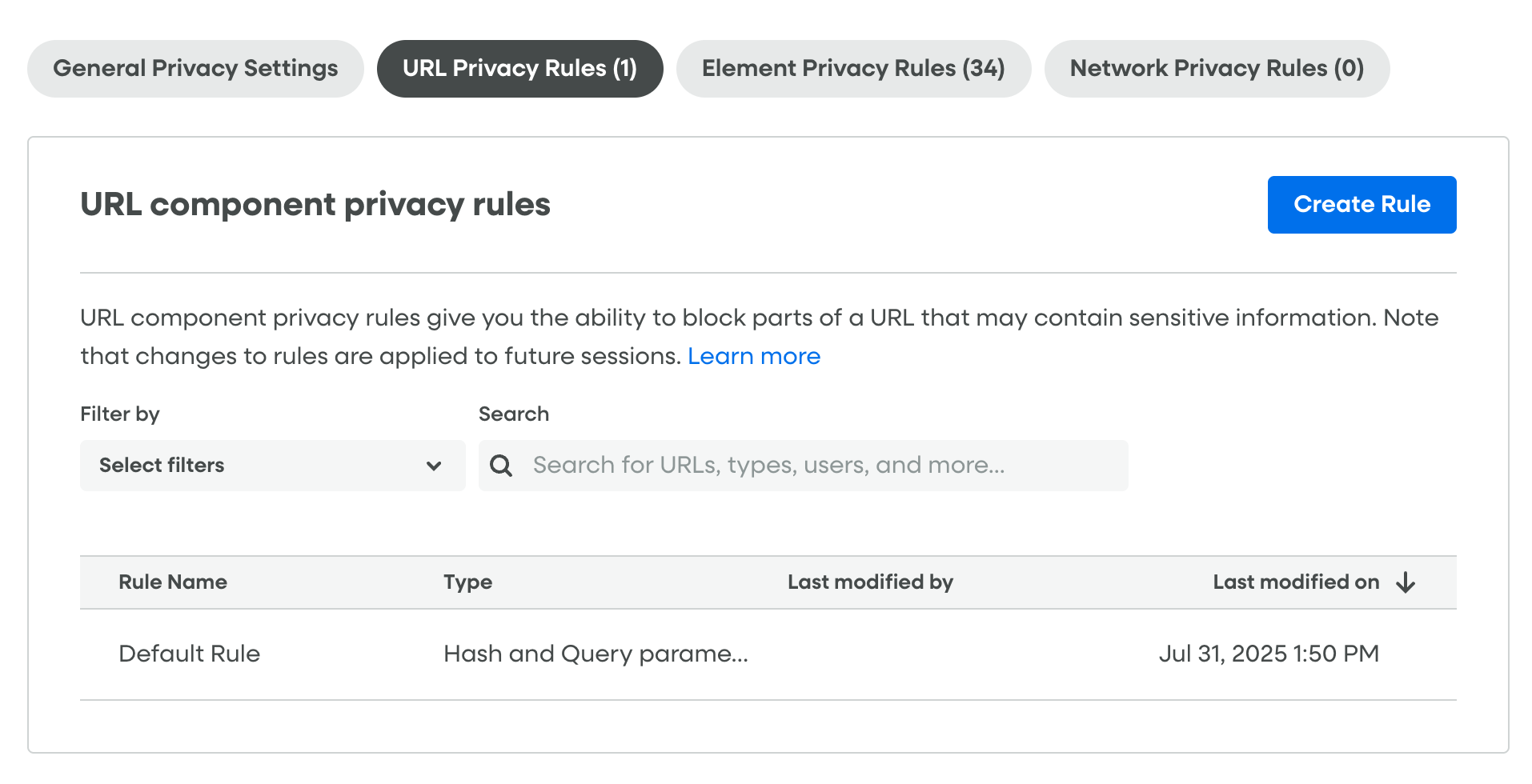 The URL Privacy Rules tab gives you the ability block data capture for parts of a URL in future sessions. Learn more.