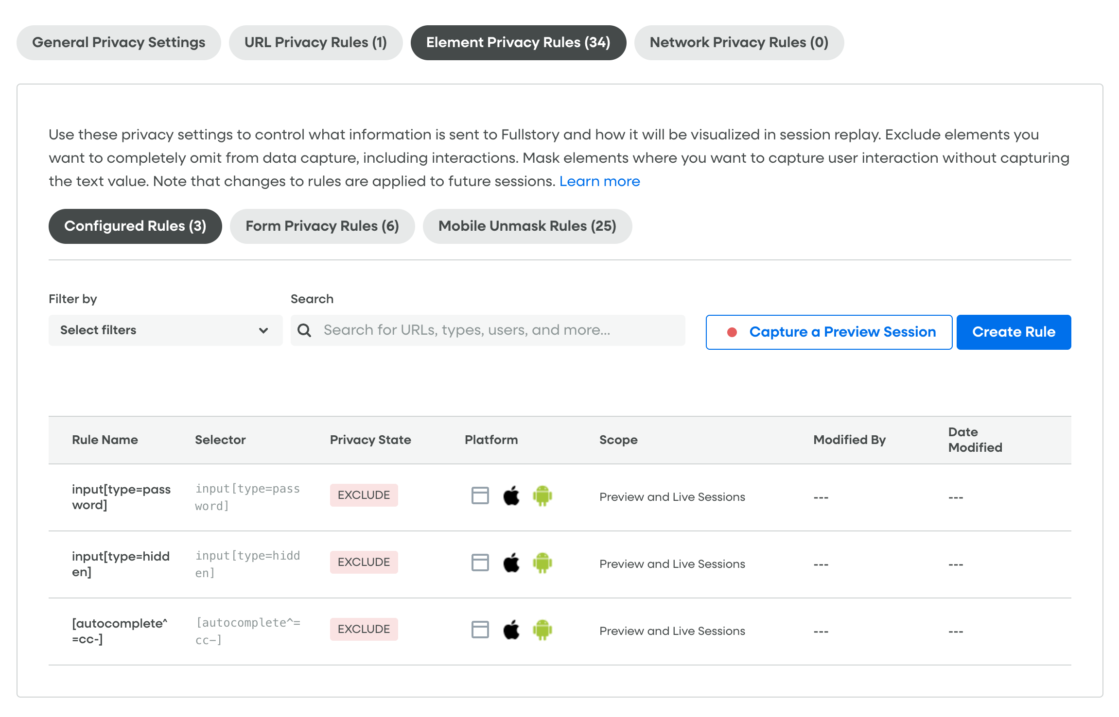 The Element Privacy Rules tab is for configuring new element data capture rules and viewing any automatically configured rules that may have been set up. This approach—configuring element data capture rules within Fullstory—serves as an alternative to the code-first privacy method.
