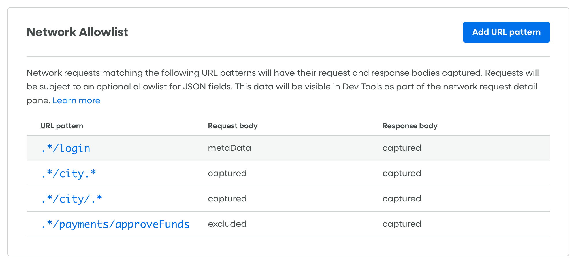 The Network Privacy Rules tab is for configuring a Network Allowlist of URL patterns, specifying how their request and response bodies should or should not be captured. Learn more.