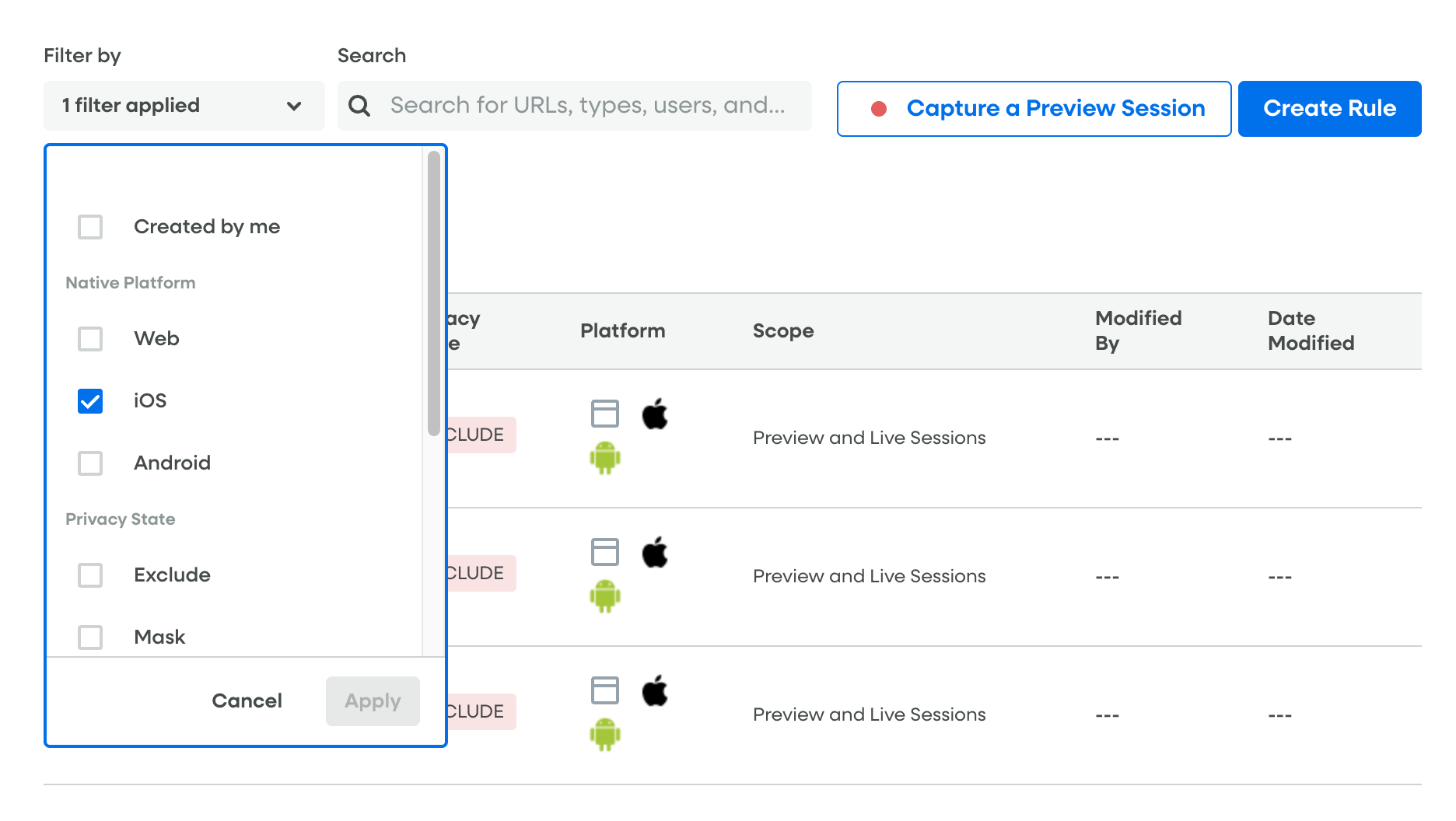 • Form Privacy Rules are the element data capture "Mask" and "Exclude" rules that are automatically configured when the account is set up with the Form Privacy privacy mode when the account is first set up. Learn more about Form Privacy.