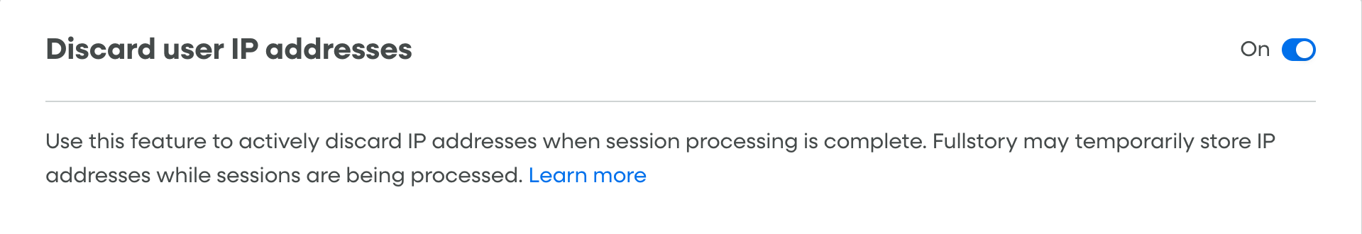 Fullstory may temporarily store user IP addresses while sessions are being processed, but will actively discard them once sessions are completely processed. When this option is enabled, you will not be able to view user IP addresses or search for users by IP address in the Fullstory UI.