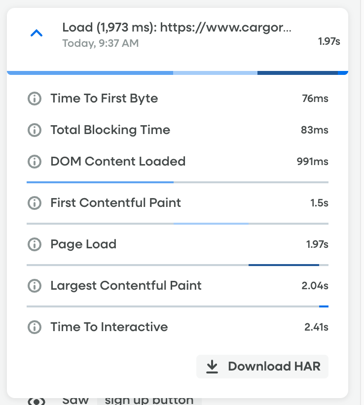The Network view in Fullstory allows you to see line-by-line network requests as they happened in the browser to load a page.