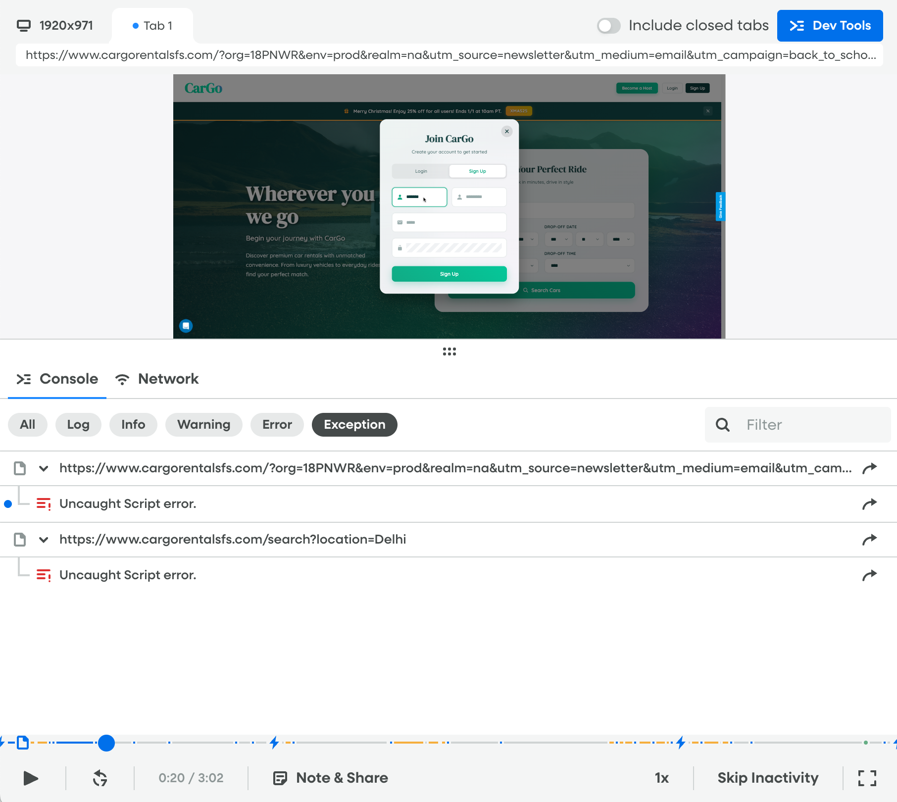 Dev Tools helps you understand how page performance—speed and reliability—affects your customer experience. Open Dev Tools during session playback to view Console and Network information for any customer session, including console messages, errors, and network requests.
