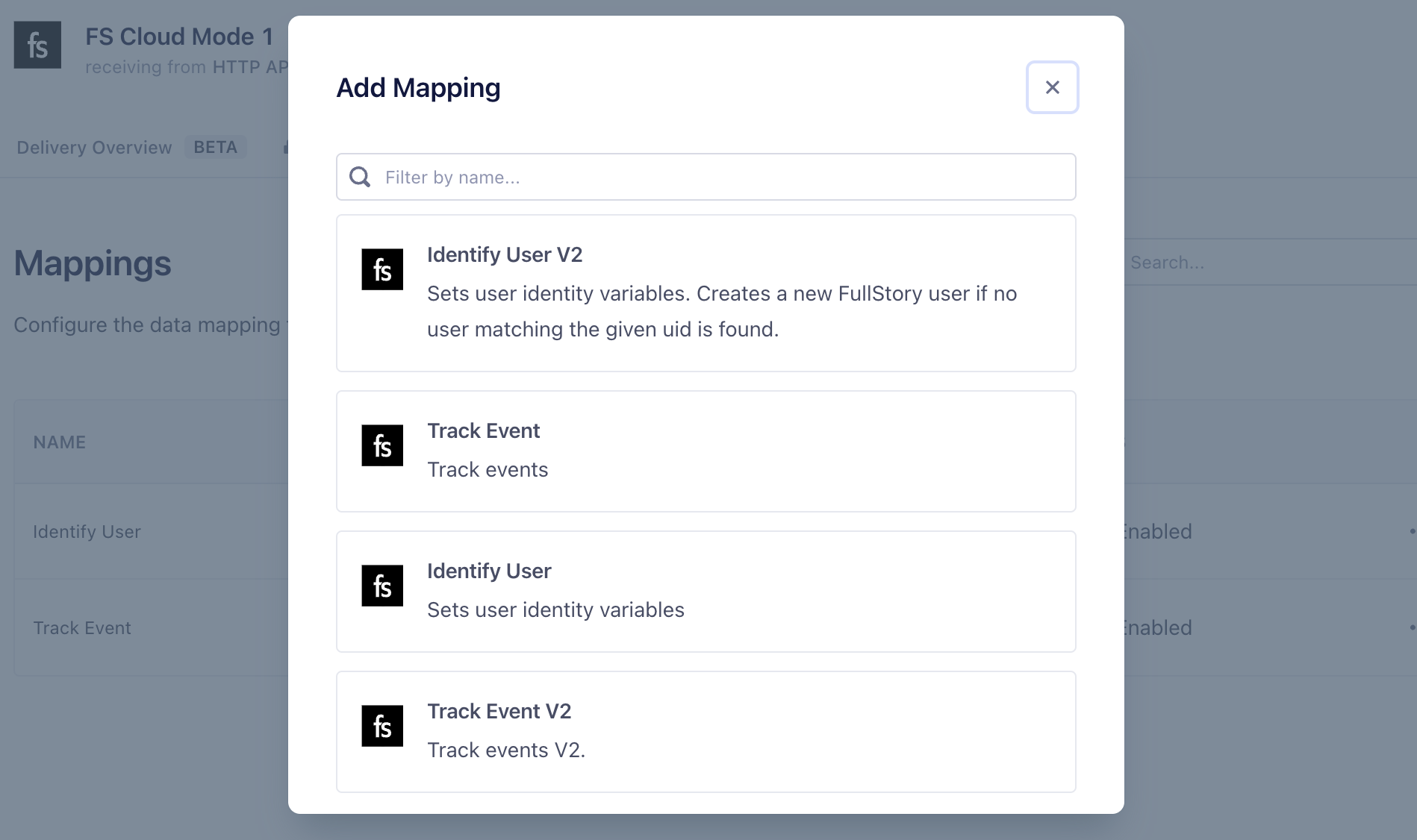 - Find & select Fullstory in the Destinations list and click it