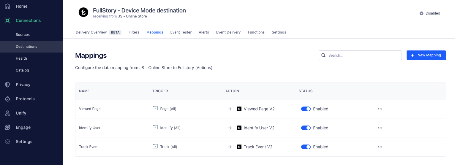 Segment's Destination Actions allows more functionality and improves upon the existing process by enabling you to see and control how event data is captured and sent to action-based destinations. The actions available in Segment that can be mapped to Fullstory's API are Identify User, Track Event, Viewed Page.