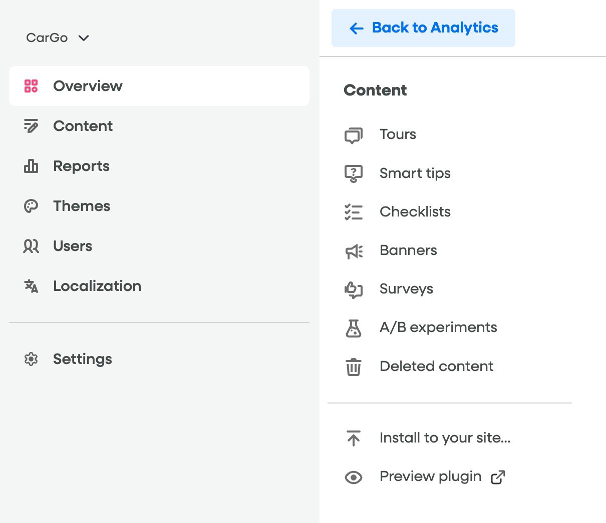 - Navigate to any content type in Guides and Surveys (such as Tours, Smart tips, Checklists, Banners, or Surveys).