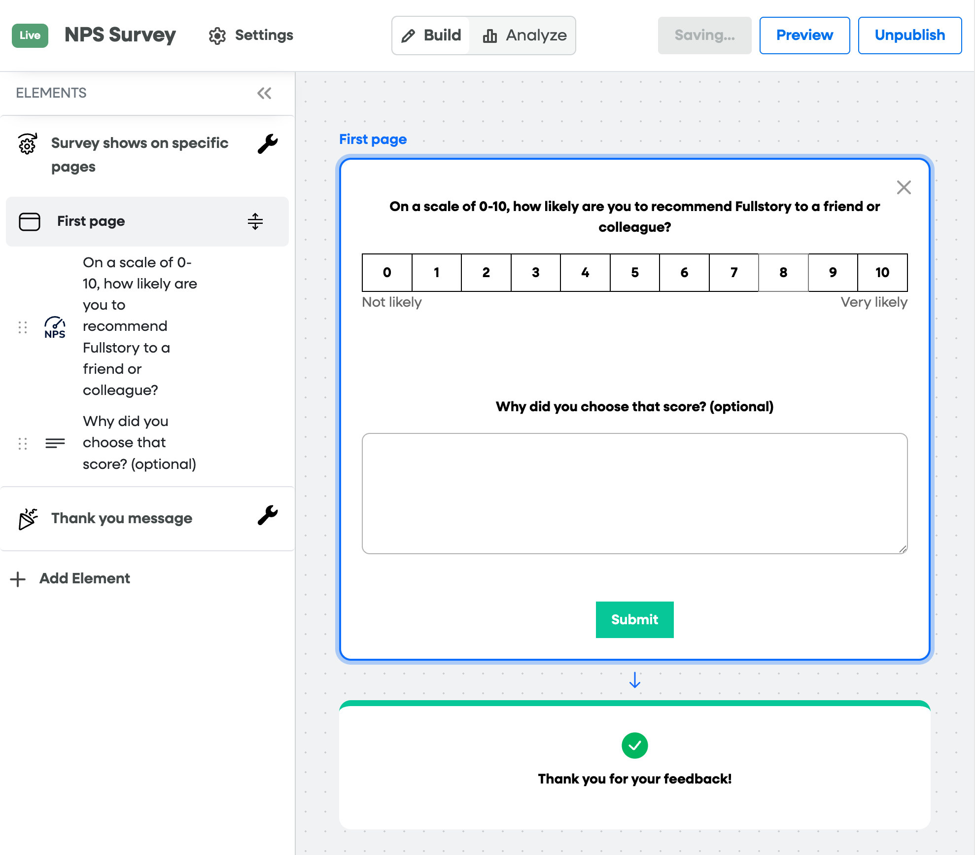 - Triggering - Surveys can be triggered either automatically or manually upon meeting defined conditions, on all pages or only a predefined page. You can limit where your survey displays using Page Targeting.