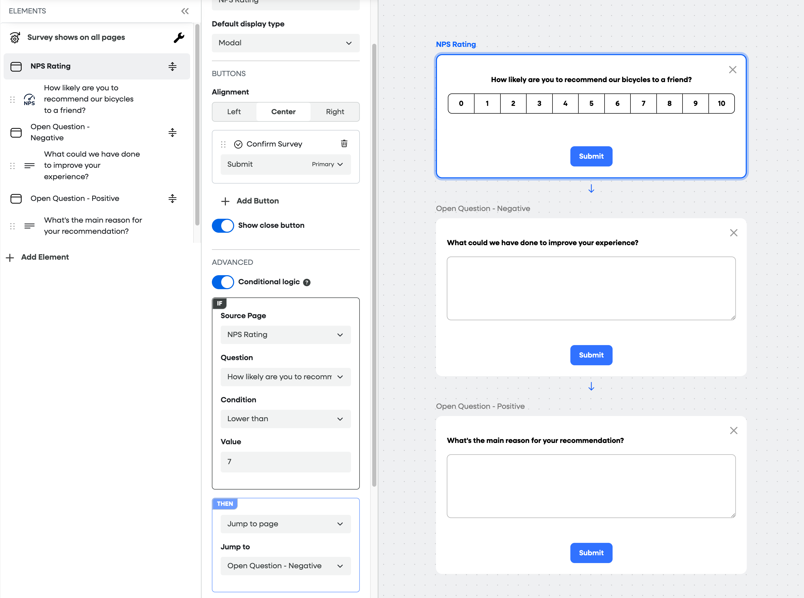 - Close Survey - Adds a dedicated Close button, which is distinct from the ✕ that can appear in the top right corner when Show close button is enabled.
