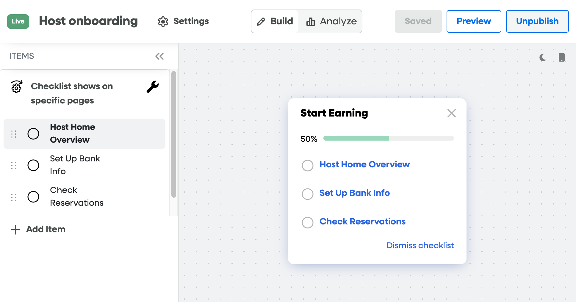 - The Dismiss button closes the checklist and the launcher button entirely for the user and will not display them to the same user again.