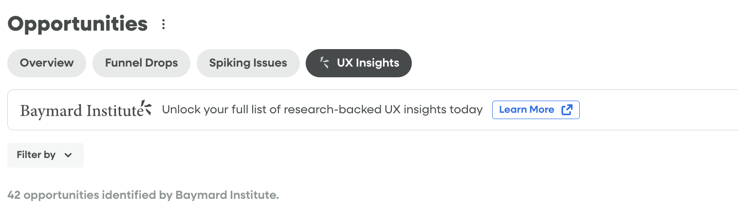 Fullstory has partnered with Baymard Institute, a leading independent web usability research organization, to integrate their UX research and insights directly into Opportunities, providing you with a powerful way to identify and prioritize critical UX improvements.
