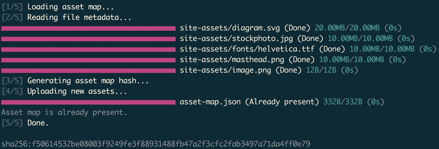 Note the hash value at the end of the output, which starts with “sha256:”. This hash value is referred to as an “asset map id”. It uniquely identifies both the asset map and the content of every asset it includes. If you’re familiar with git, the asset map id is the equivalent of a commit hash.