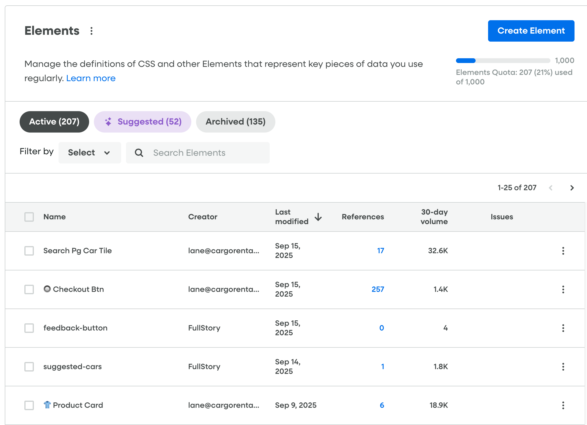 If you no longer wish to see data in Fullstory, you will need to stop this being passed into Fullstory from the source, e.g. updating API calls or creating custom data layer rules. If you have any questions around archiving / deleting elements, events, properties or pages, please reach out to the support team.