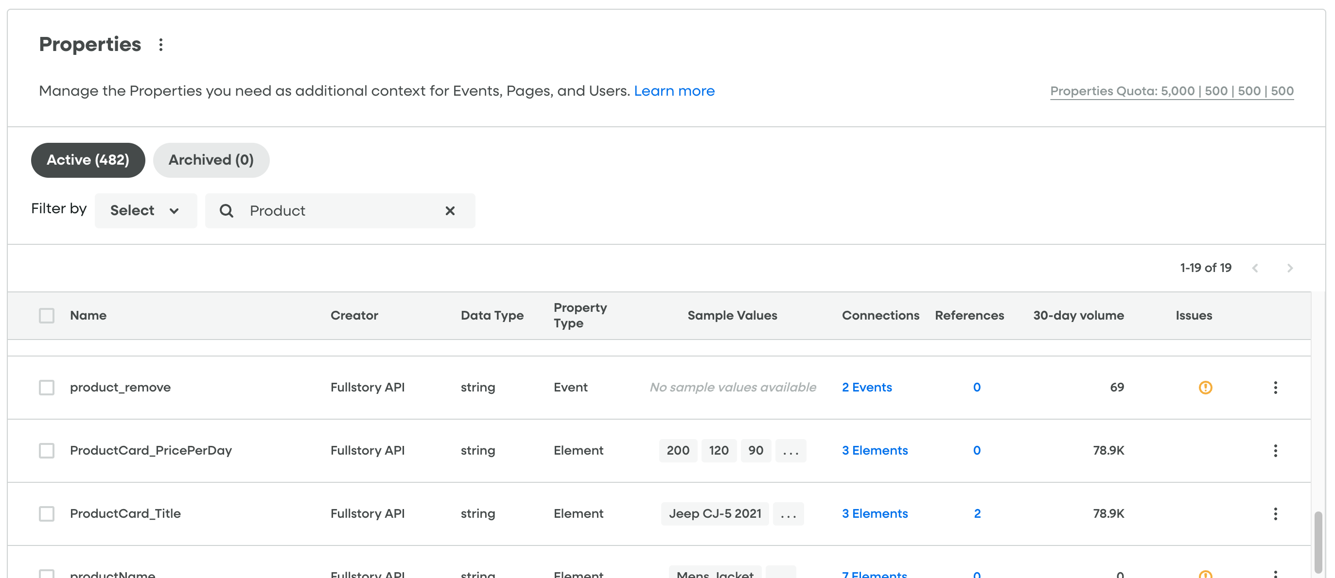 Use custom user properties like displayname, to give each visitor to your site a distinct display name in the Fullstory UI that you can easily search for later. An admin or architect can manage the properties that have been sent to Fullstory via an API and archive properties that are deprecated or that were created by mistake (typos, etc). Additionally, you have the ability to see what API events are connected to specific properties in the Connections column.
